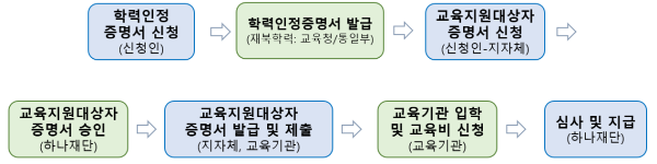 o 입학 전: 학력인정증명서 발급 - 북한학력(전문대졸이상): 통일부 정착지원과 신청(3개월 소요) - 북한학력(고등학교): 시·도 교육청에 ‘학력인정증명서’ 신청(1개월 소요) ※ 구비서류: 주민등록등본, 북한이탈주민확인서, 북한이탈주민 학력확인서 - 국내고등학교 졸업: 졸업예정증명서 또는 졸업증명서 - 검정고시 합격자: 고졸검정고시 합격 증명서 - 해외고등학교졸업자: 입학하고자 하는 교육기관(대학)에 문의 ※ 입학 후 학력인정 받은 교육생은 지원 불가 예: 2025.3.01. 00대학에 입학, 학력인정일 2025.3.06. 지원불가 중요:‘북한이탈주민 학력확인서’는 학력인정증명서가 아님 o 입학 후: 교육지원대상자 증명서 발급 및 제출 - 교육지원대상자 증명서 발급(학력인정증명서 발급 후 지자체에 신청), 10일 소요 ※ 자녀인 경우 가족관계증명서(상세), 부모의 북한이탈주민 확인서 준비 - 서류제출(교육생→교육기관): 교육지원대상자 증명서, 북한이탈주민 확인서 등 |